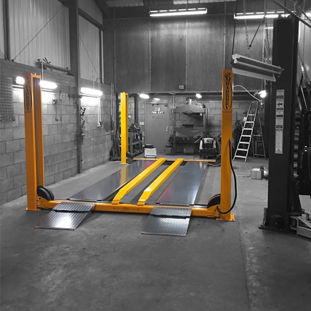 The Bradbury wheel free lift is one of a kind and is highly versatile! This patented product, which has been around for decades, is almost like having two lifts in one. The wheel free beams, which slide laterally along the cross beam to jack the vehicle up, lift in conjunction with the platforms which can then be lowered whilst the vehicle remains in place in the air on these wheel free beams! The specially designed vehicle parking system is fully automatic and managed entirely by the control box.